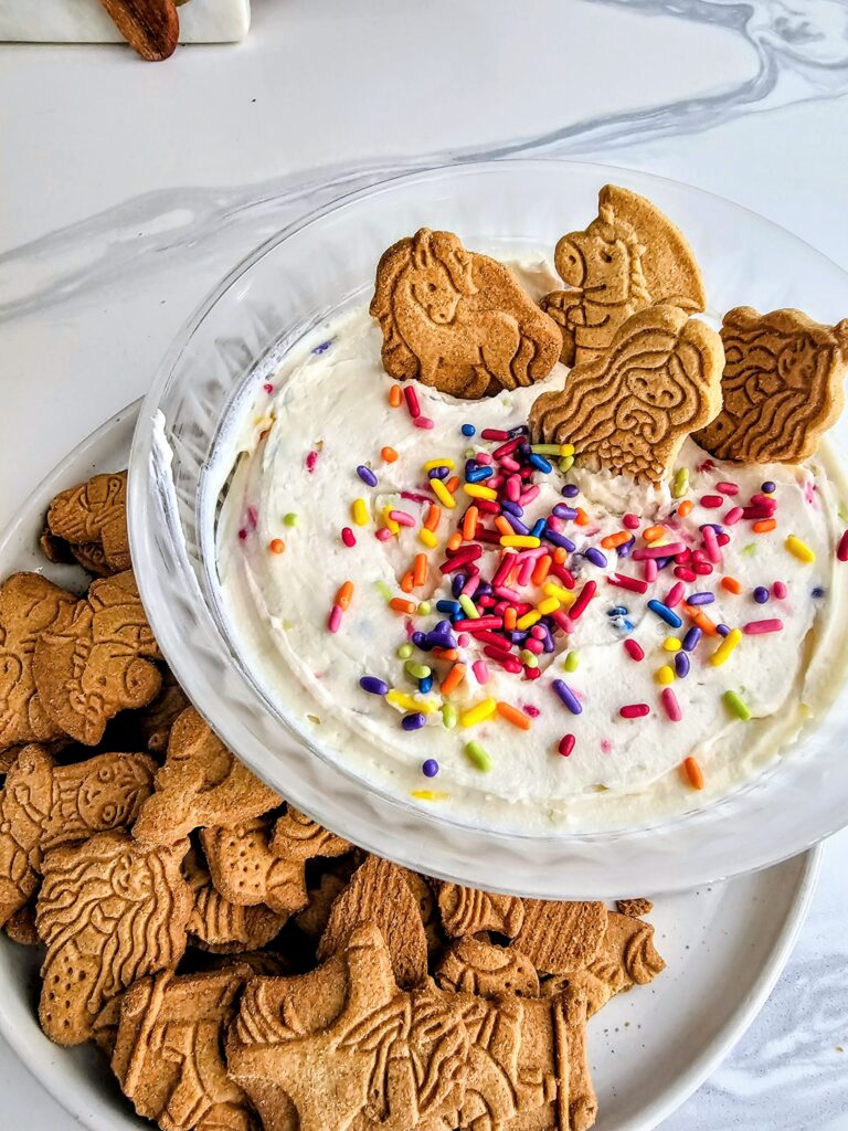 This high protein Dunkaroo dip is also incredibly versatile. It pairs perfectly with gluten-free graham crackers, gluten-free animal crackers, fresh fruit, or rice cakes. As a result, it works just as well for after-school snacks, lunchboxes, party platters, or a healthier dessert option.